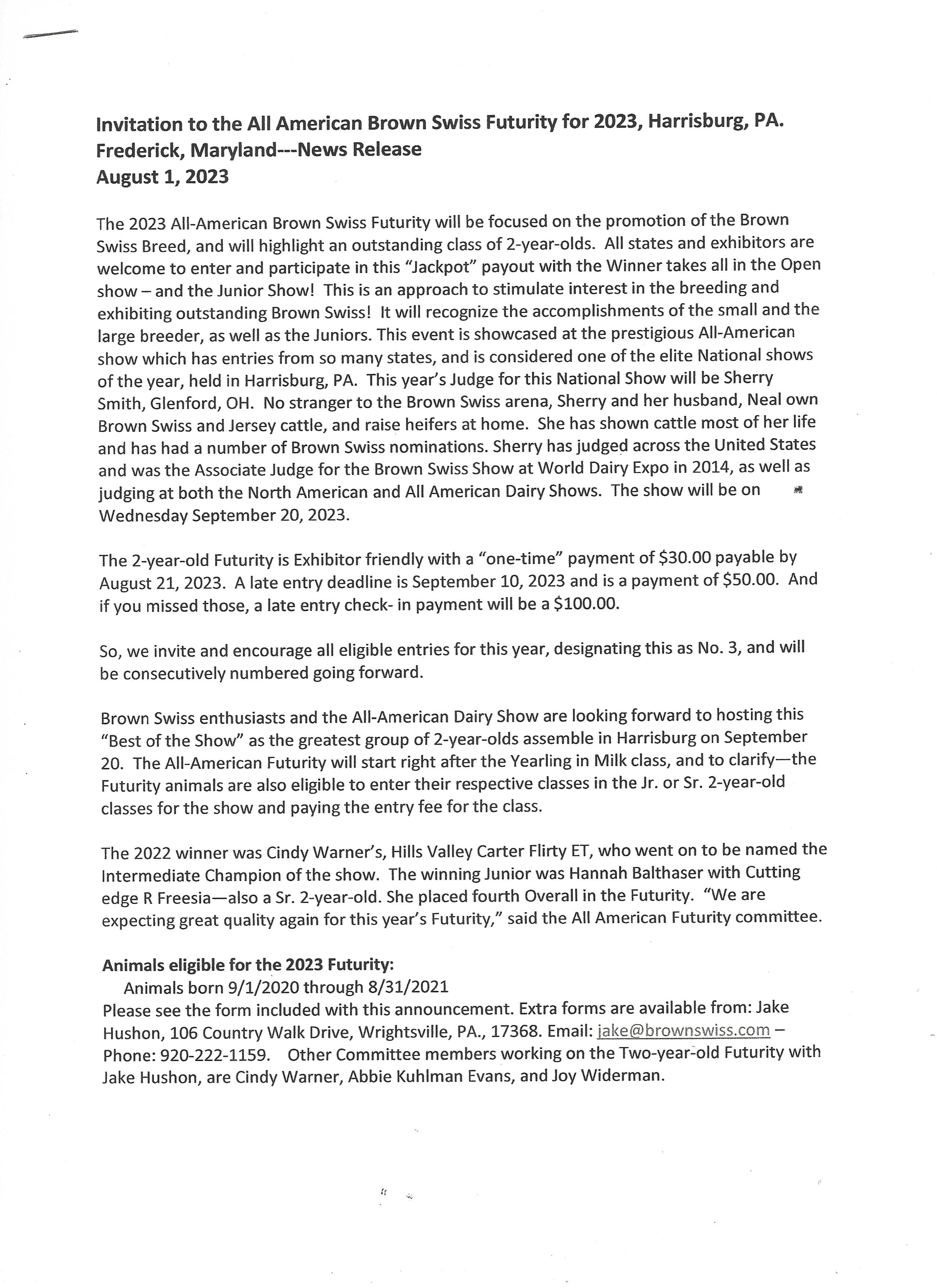 Invitation to the ALL-AMERICAN DAIRY SHOW Brown Swiss Futurity for 2023